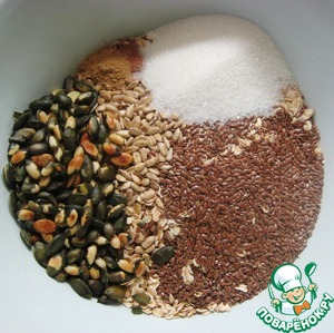 В миске смешать овсяные хлопья, семечки тыквы и подсолнуха, семена льна, корицу и имбирь, добавить сахар и щепотку соль.