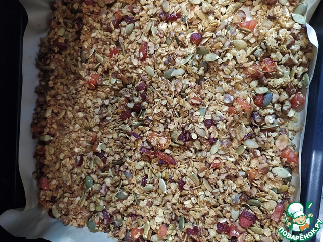 Вынимаем из духовки золотистую гранолу и даем полностью остыть на противне, перемешиваем и складываем в банку.