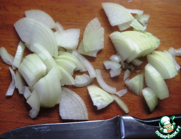 Нарезать лук, разогреть на сковороде растительное масло и отправить обжариваться лук.