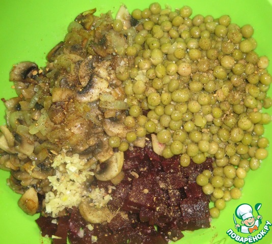 Соединить в миске нарезанную свеклу, маринованные огурцы, обжаренный лук с шампиньонами, зеленый горошек (жидкость из банки с горошком предварительно слить).