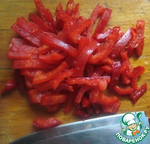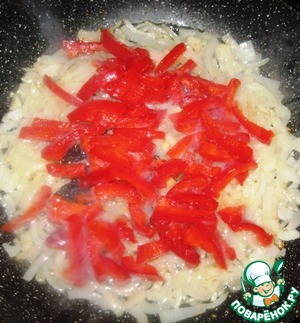 Добавить нарезанный сладкий перец в сковороду к луку. Обжаривать всё вместе 3-4 минуты, помешивая.