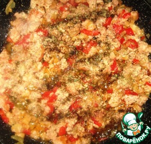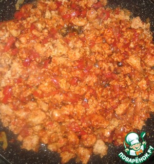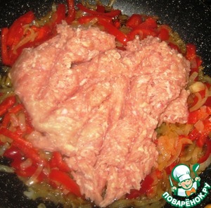 Добавить фарш. Обжаривать, помешивая до готовности фарша.