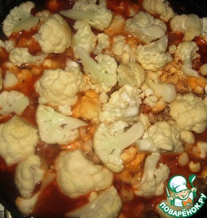 Добавить в сковороду разобранную на маленькие соцветия цветную капусту. Налить горячей воды, чтобы овощи были практически покрыты. Накрыть крышкой и тушить на маленьком огне до готовности капусты.