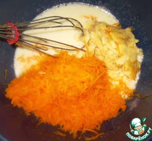 Яйца взбить с сахаром, добавить размятые вилкой бананы и натертую на мелкой терке тыкву. Перемешать.