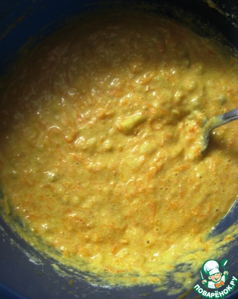 Всыпать частями кукурузную муку, тщательно перемешивая тесто (по консистенции, как на густые оладьи).