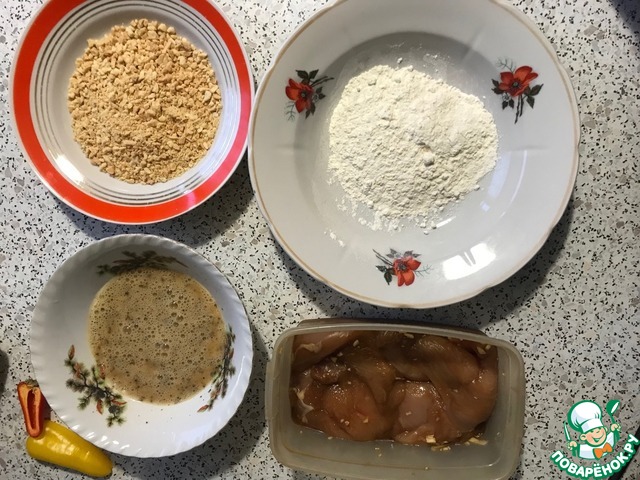 Подготовить тары для панировки - мука, яйцо, арахис.