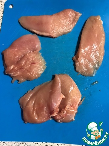 Отбиваем, примерно толщиной 1 см. Я использую пакет, чтобы не было брызг