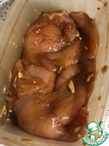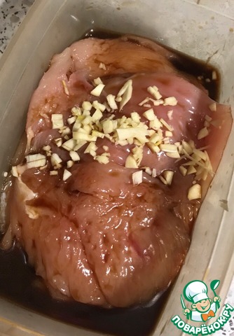 В тару для маринования выкладываем филе, заливаем соусом, добавляем чеснок. -