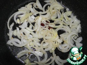 Лук очистить, нарезать полукольцами и обжарить в чистой сковороде в оставшемся масле, 5 мин.