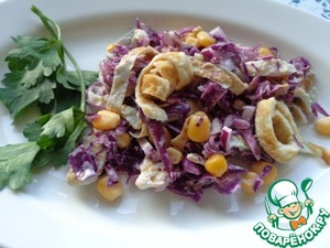 Капусту краснокочанную нашинковать и перетереть с солью. К капусте добавить красный лук нарезанный полукольцами, кукурузу, ленты из яиц, майонез, остальную соль. Всё перемешать.