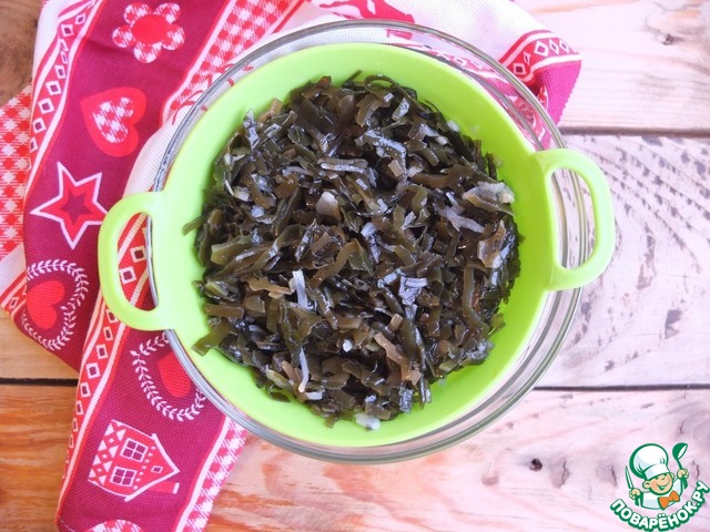 Морскую капусту откинуть на сито, чтобы с нее стекла лишняя жидкость.