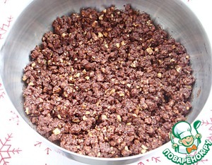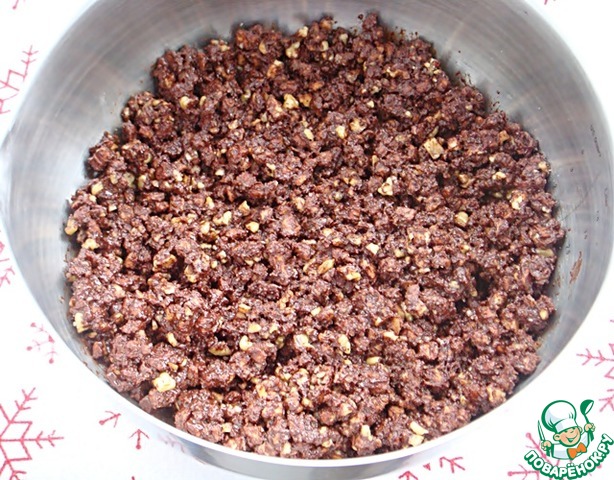 Перемешать и растопить на среднем огне, постоянно помешивая. В миске соединить печенье и орехи, залить получившейся шоколадной смесью.