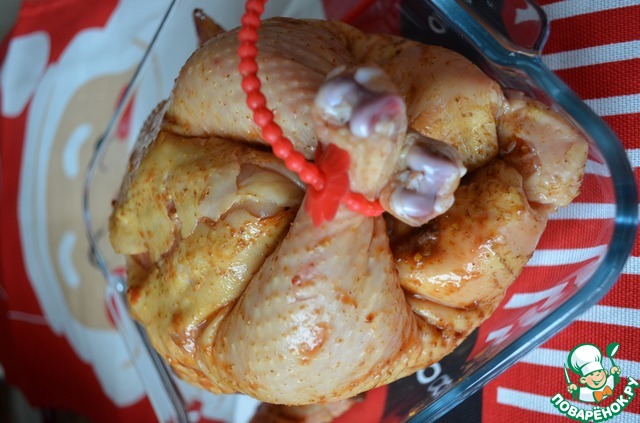 Перед приготовлением курицу переложить в форму для запекания, подержать 1-2 часа при комнатной температуре. Ножки связать.