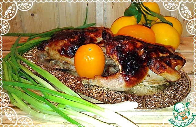 Запекать курицу при 200 градусах 45 минут, полить образовавшимся соком, затем прикрыть фольгой и допечь 30 - 50 минут, при 150 градусах, до прозрачного сока при проколе.