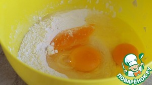 В миску насыпаем 1 стакан муки, разрыхлитель, соль и выбиваем яйца. Тщательно перемешиваем ложкой.
