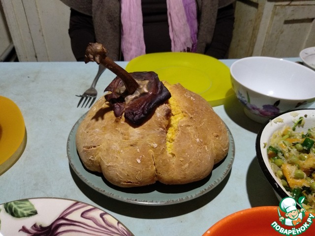 Формуем хлеб. Можно выложить в форму для выпечки или оставить круглым. А можно придать ему вид тыквы: сделать надрезы ножом или ниткой и вставить "хвостик" от настоящей тыквы. Выпекаем в духовке при 180 градусах около 30 минут. Может понадобиться чуть больше времени, все зависит от вашей духовки, проверяйте готовность палочкой. Я выпекала в МКВ в режиме "Конвекция".