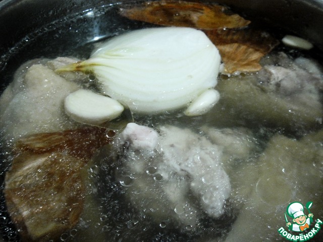 Я думаю, что каждая опытная хозяйка готовит заливное своим способом, но а тем кто делает это редко или вообще впервые, хочу подарить один очень простой секретик. После всех манипуляций с мясом (зачистили, замочили, помыли) оно у Вас варится на среднем огне (едва кипит, пенку сняли), вот тут Вы и добавьте в него луковицу, морковь, чеснок и ШЕЛУХУ от репчатого лука. Она придаст красивый цвет бульону, аппетитный аромат и сделает бульон прозрачным.