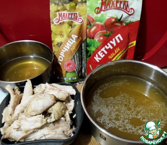 Остывшее мясо нарезали на кусочки средних размеров (примерно как на жаркое, можете пластами, главное не надо мельчить). Добавили к мясу горчицу, перемешали, дали пропитаться и теперь можно подправить на свой вкус солью, но не забывайте, что мы будет заправлять бульон кетчупом и майонезом, они уже соленые. Мясо так же разделите на три части.