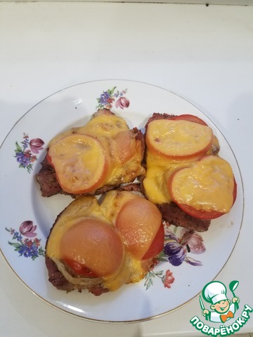 Выложите ломтики сыра на мясо поверх помидоров и верните противень в духовку, чтобы сыр растаял и немного подрумянился. Подавайте свинину очень горячей.