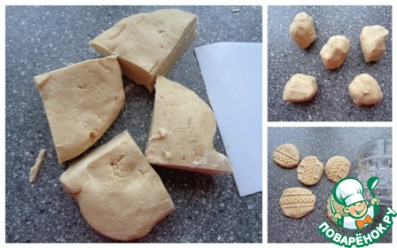 Разогреть духовку до 180 градусов. Достать тесто, поделить на четыре части. Каждую четвертинку поделить на пять равных частей. Итого получится 20 заготовок для печенюшек. Раскатать заготовки в лепешки подручными средствами с рисунком (например у меня стакан) или воспользоваться формочками. Для кулинарного шприца это тесто тоже подходит, если будете формировать шприцом - тесто не нужно класть в морозилку. Тесто эластичное и послушное.