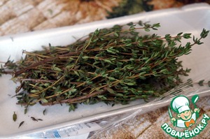 Все слегка сбрызнуть оливковым маслом, сверху положить несколько веточек тимьяна.