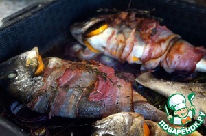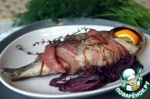 Внутрь двух других положить по 3-4 листочка шалфея, лимон, обернуть каждую рыбину полоской бекона. Уложить на подушку из красного лука.
