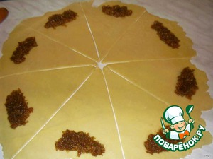 Раскладываем начинку (я начинку делю на 4-ре части, а потом каждую четверть равномерно распределяю. При таком способе начинка не остаётся).