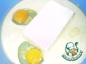Пока варится начинка, готовим тесто. Для этого смешиваем яйца, молоко, растительное масло, маргарин комнатной тем-ры и разрыхлитель. Я вымешиваю всё руками.