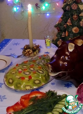Слои выкладываются в такой последовательности: курица-корейская морковь-яйца-яблоки-сыр-киви. Каждый слой (кроме киви) смазывается майонезом.