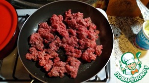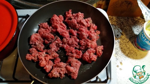- Фарш мясной (фарш домашний свино-говяжий обжарить до готовности. Лук не добавлять. Булку ТЕМ БОЛЕЕ!!!!!!) — 200 г