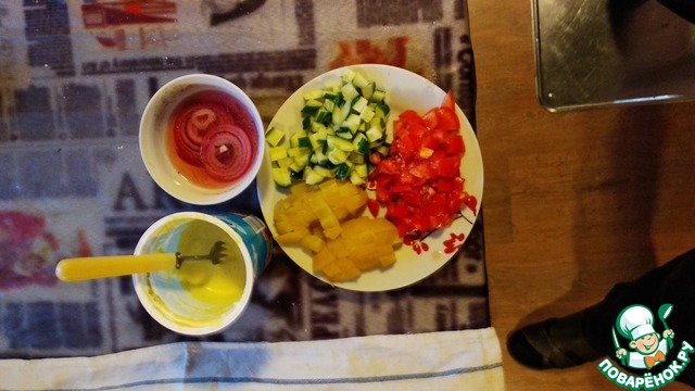 Заранее, за несколько часов. заготовим соус и лук в уксус. Нарезаем, пока жарится фарш, огурцы и помидоры. Солим и ждем, пока они дадут сок. Режем мелко отварную картошку.