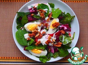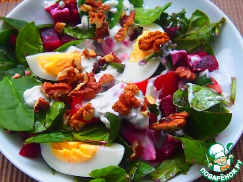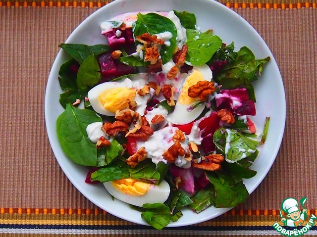 В тарелку выложит салат, полить соусом, сверху положить несколько долек яиц и посыпать орехами.