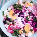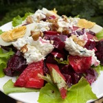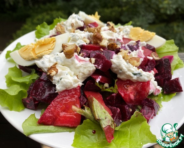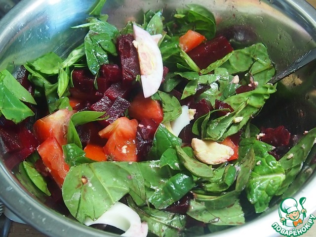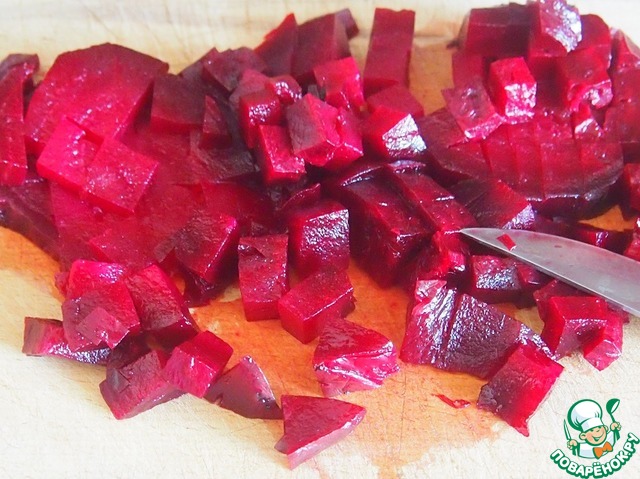 Время приготовления указано без учета запекания свеклы. Свеклу средних размеров вымыть, завернуть в фольгу и запекать в духовке при температуре 180 градусов до готовности. Потом остудить и нарезать на кусочки, не мелко.