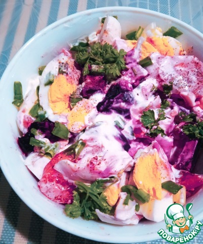 Яйца сварить вкрутую и охладить, разрезать на четыре дольки. Половину яиц добавить в салат и слегка перемешать.