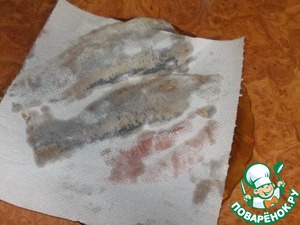 Соскабливаем черные пленочки с реберных частей и промываем рыбу под проточной водой. Возвращаем на доску, сменив перед этим бумагу на доске.