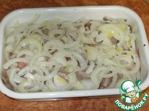 Оставляем на 1 час при комнатной температуре. Чтоб рыба не обветривалась можно прикрыть пищевой пленкой или накрыть сверху тарелкой. Пока сельдь солится нарежем лук тонкими полукольцами и приготовим смесь из растительного масла и уксуса. По прошествии часа необходимо филе сельди и молоки сполоснуть под проточной водой. Обсушиваем бумажными полотенцами и нарезаем на кусочки примерно 1 см шириной.