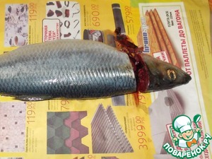 Свежемороженую сельдь необходимо полностью разморозить! Кладем на разделочную доску и отрезаем голову. (Я всегда при работе с сельдью застилаю доску газетами, но это не обязательно!)
