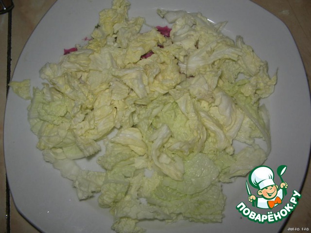 На тарелку (а салат лучше подавать порционно) выложить либо листья салата, либо пекинскую капусту, которую лучше, не мелко, но нарезать.