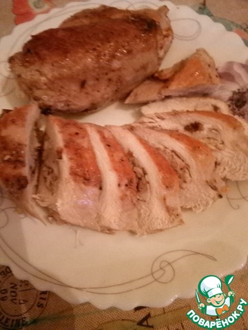 Добавить сухие яблоки, которые добавят кислинку и запекать фаршированные грудки при