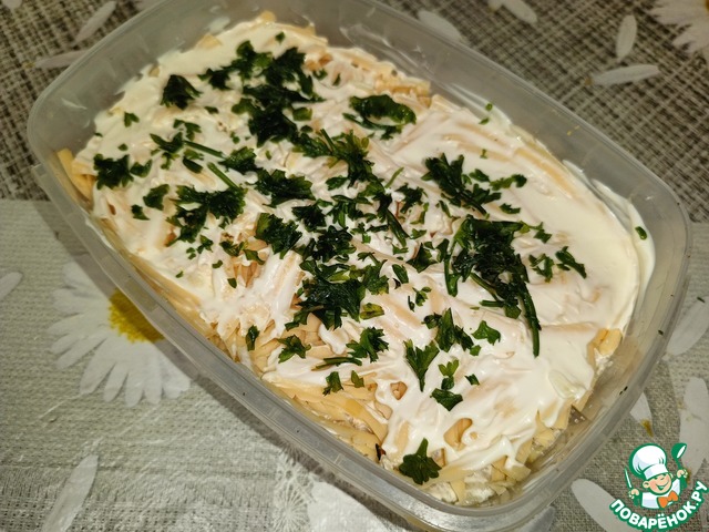 Укладывается салат слоями. Можно в большую салатницу, можно порционно.