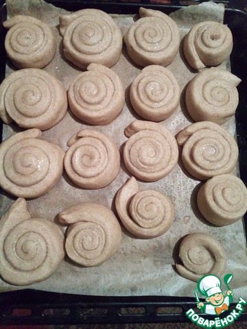 Свернуть в рулет и нарезать на кусочки ( те кусочки, что толще, больше как булочки, те кусочки, что потоньше напомнили нам плюшки).