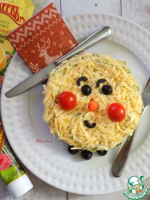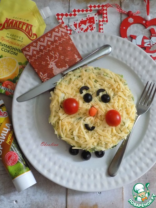 Режем яйца перепелиные или куриные, отправляем в салатник. Заправила салат по своему вкусу майонезом и горчицей. Поперчила и немного посолила. Если салат будут есть дети, то горчицу и перец класть не нужно. Тщательно перемешиваем. Если будите делать салат без формирования мордочки снеговика, то сыр следует натереть и добавить в салатник. Я сыр оставила на верхний слой салата.