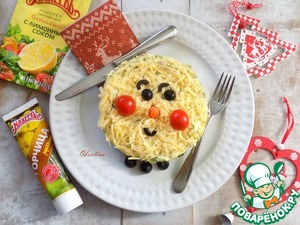 Я буду формировать мордочку снеговика и для этого взяла форму разъёмную для выпечки, соответствующую по диаметру блюду, в котором буду подавать салат. В идеале конечно кольцо, но у меня только маленького диаметра есть. Выкладываем салат в форму, уплотняем. Я использовала силиконовую лопаточку. Натираем сыр...