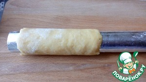 Тесто раскатать толщиной 0,3-0,5 см. Нарезать на квадратики (≈13*13см)