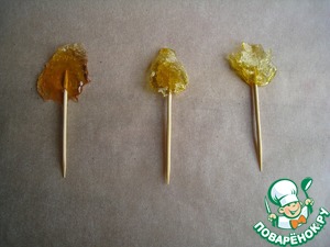 Леденцы разбить, положить на противень с бумагой для выпечки. Растопить в духовке в течение 3-4 минут. Придать форму пламени, вставить палочки. Охладить.