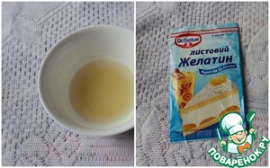 Желатин нужно замочить. Удобно использовать листовой желатин «"Dr. Oetker"», 5 г - это 3 листочка. Их нужно замочить на 5 минут и потом отжать. Можно использовать обычный порошковый желатин (5 г – 1,5 ч. л.). Его нужно залить 2 ст. л. холодной воды и оставить на 30 минут.