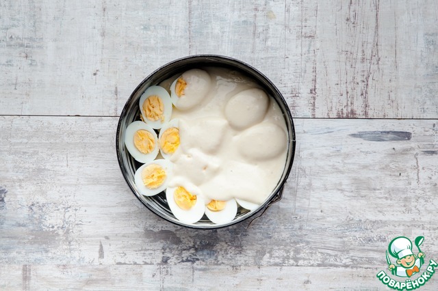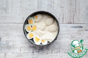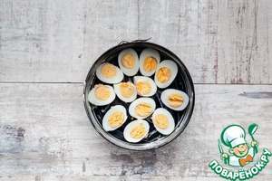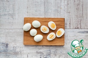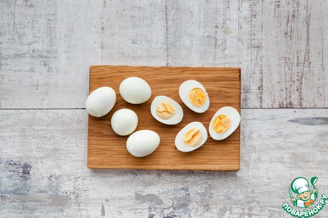 Яйца сварите вкрутую, 8 мин. Положите в ледяную воду на 5 мин., очистите и аккуратно разрежьте вдоль пополам.