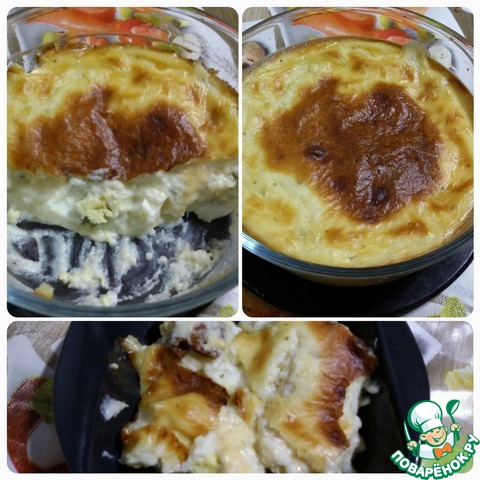 Залейте соусом яйца и поставьте форму в духовку запекаться до румяной корочки, примерно 20 мин. Перед подачей посыпьте тонко нарезанным зеленым луком.