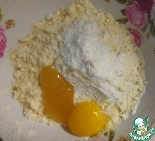 Добавить сахарную пудру, мёд и желток, замесить тесто.