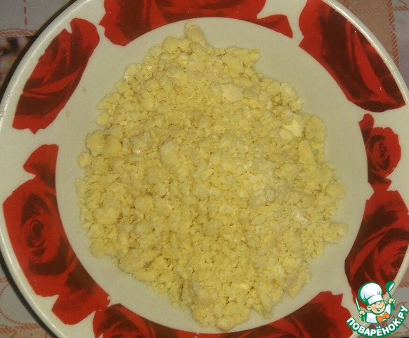 В миску насыпать муку, соль, сахар и цедру, перемешать. Добавить масло. Перетереть всё руками в крошку.